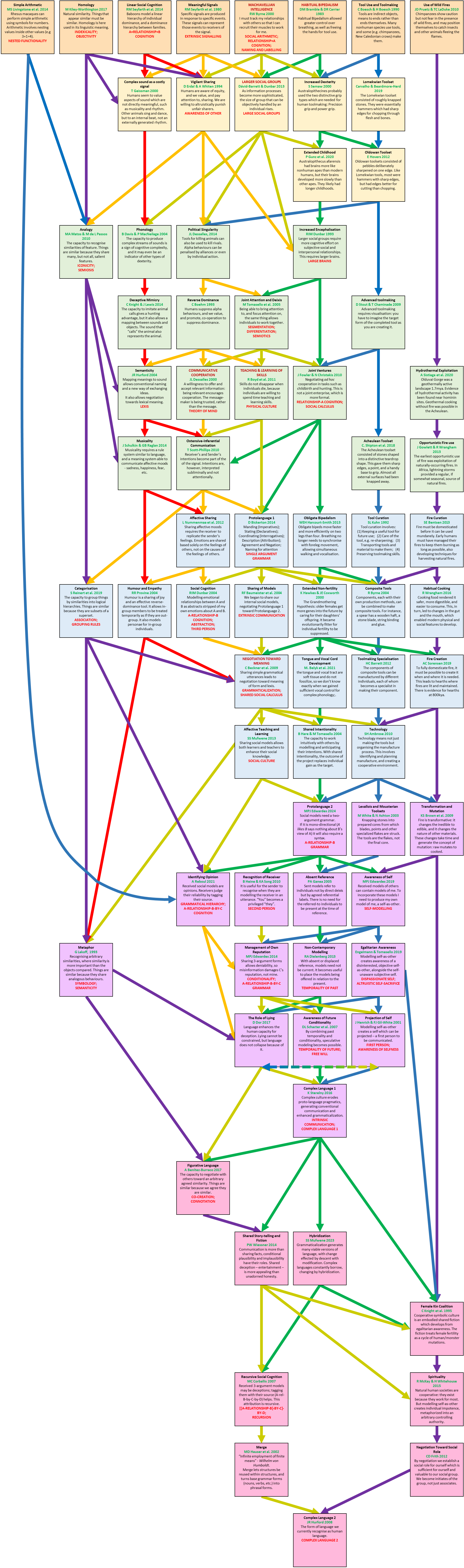 The model shows a series of capacities, given in a rough time order and with dependencies indicated. A timescale is not given, but the capacities are colour-coded by probable species, as follows: ·